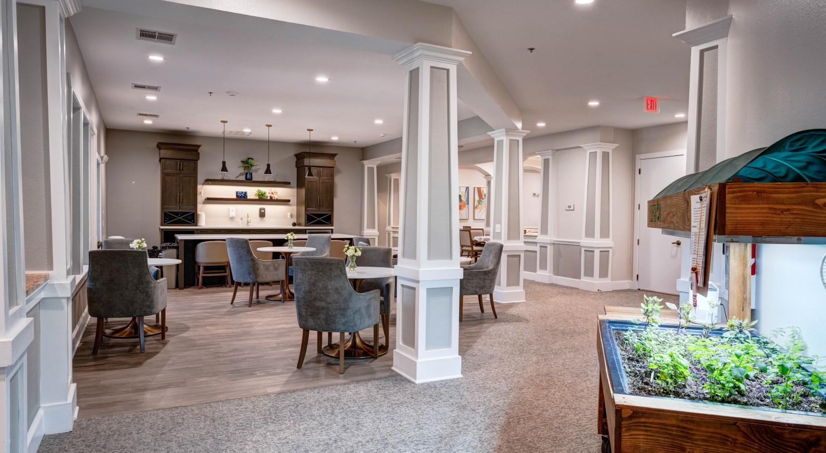 • a large room with tables and chairs
