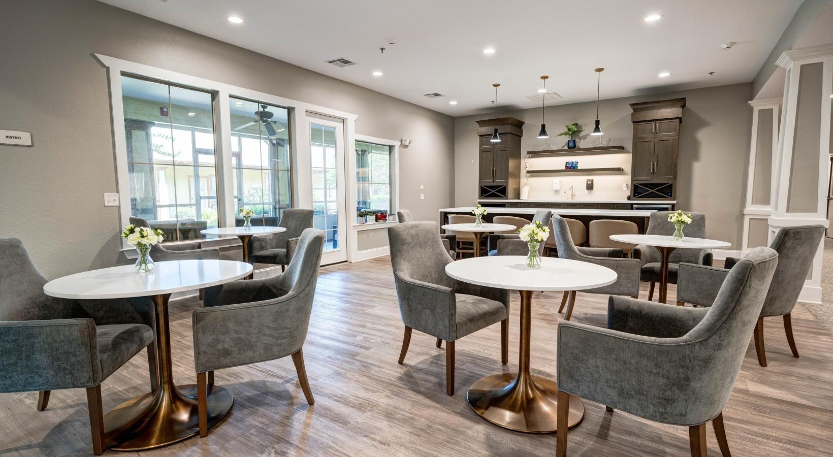• resident kitchen area with tables, chairs and a bar with bar stools