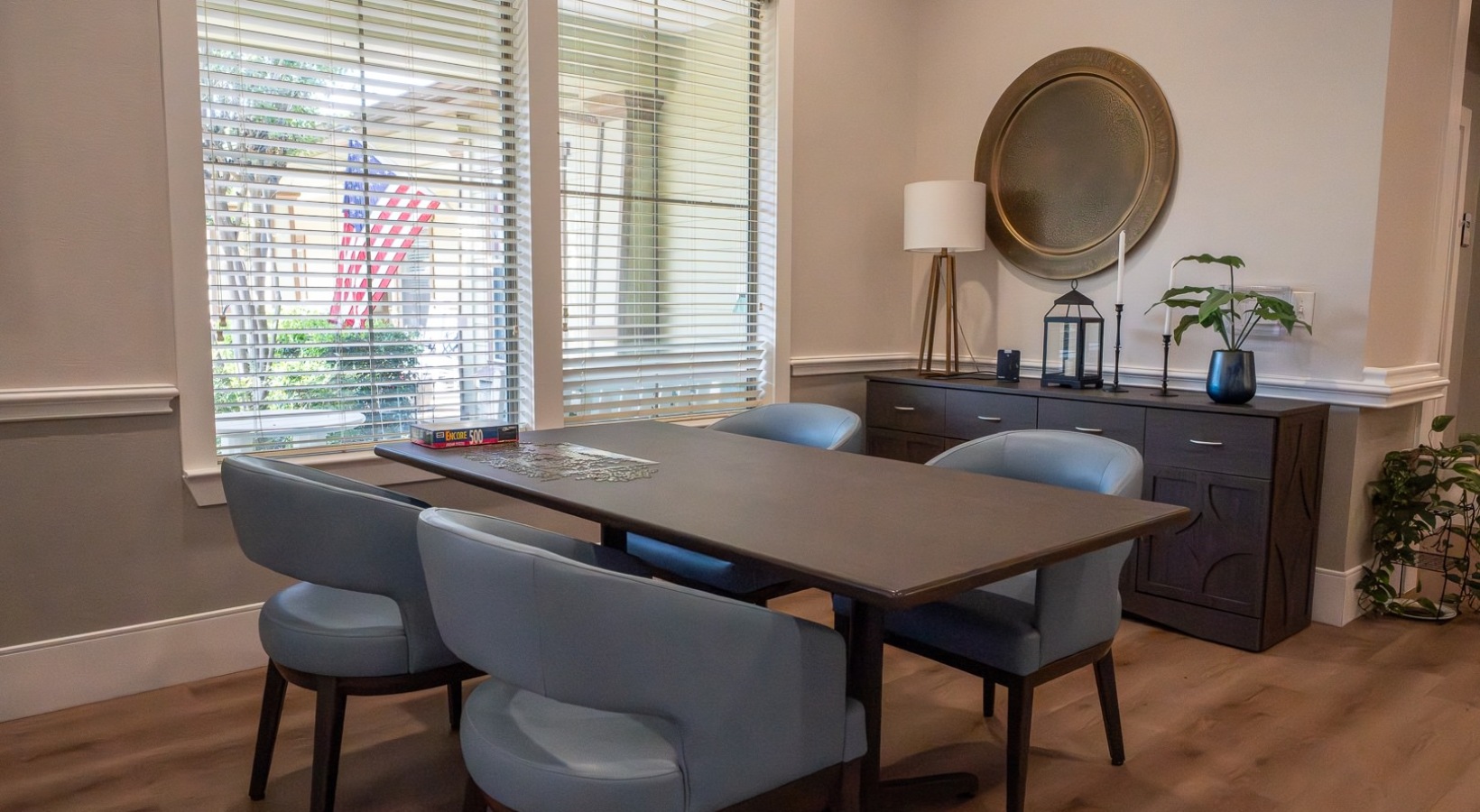 • chairs and a table with a puzzle on it in a room with a window